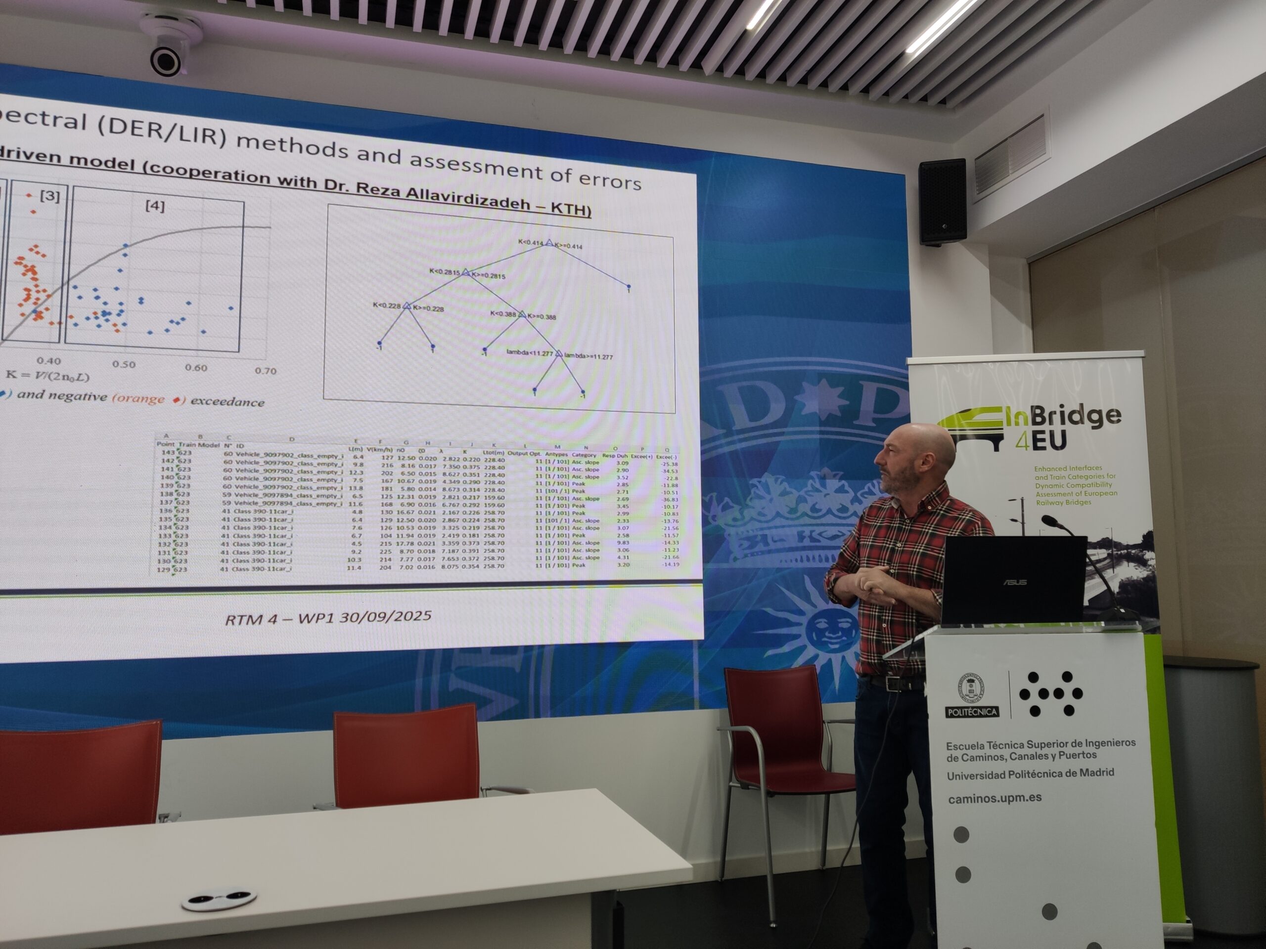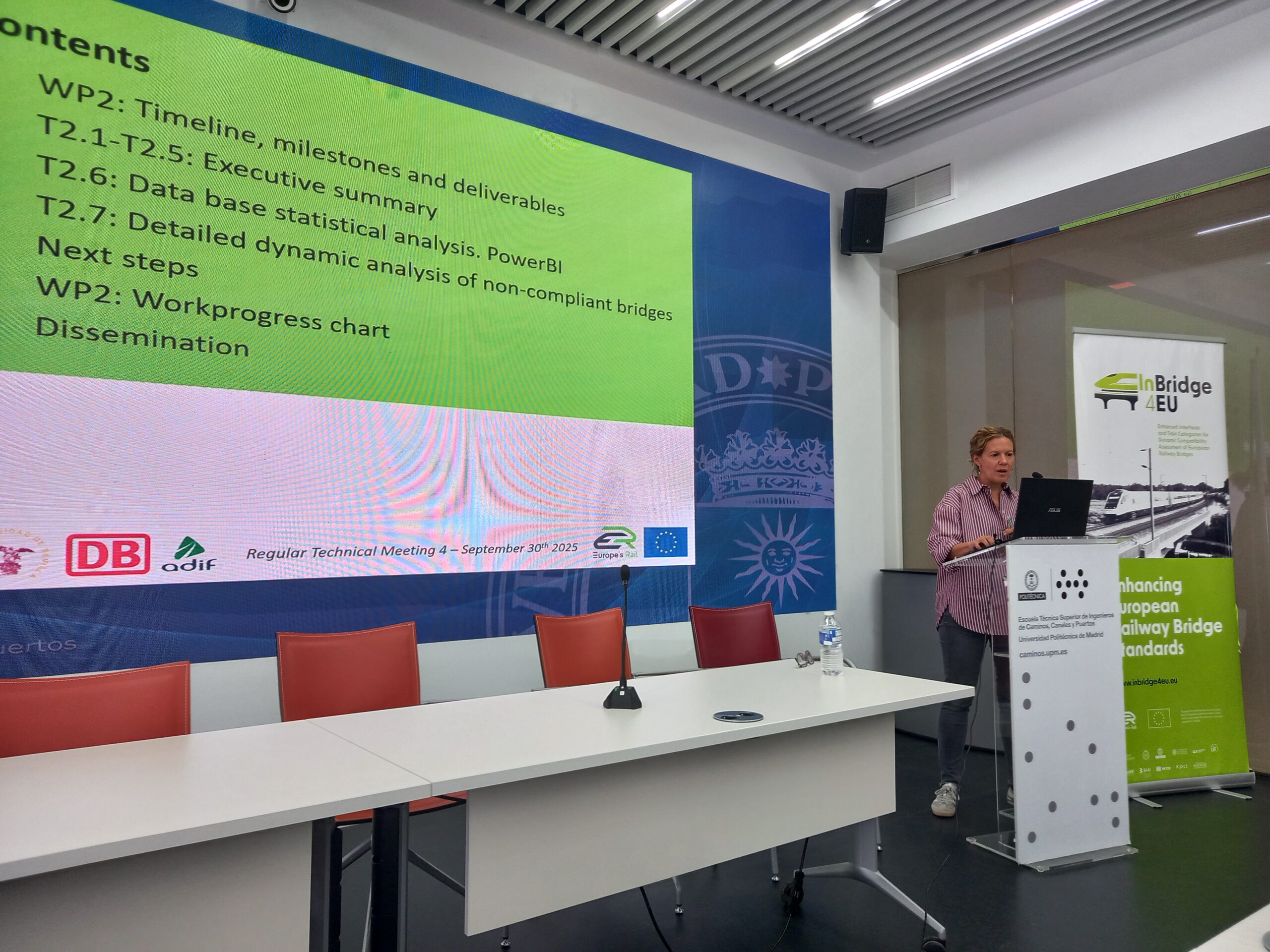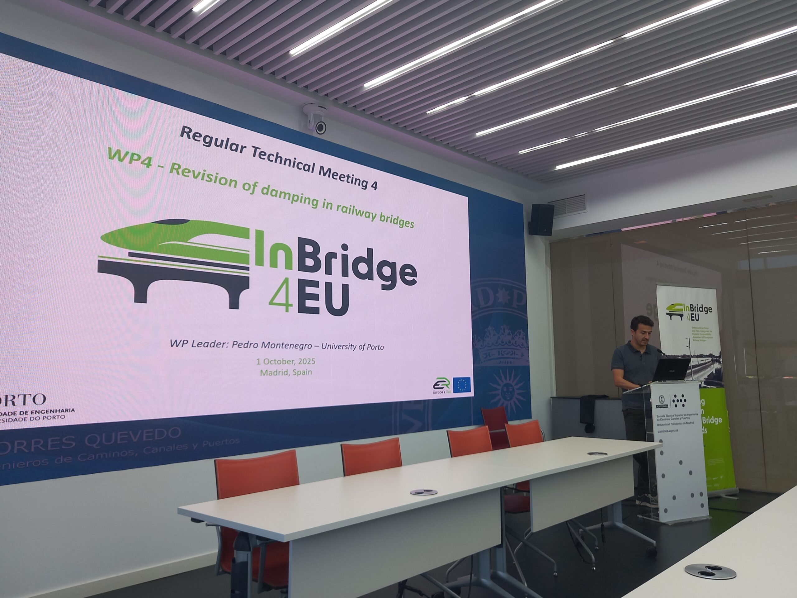 On September 30 and October 1, the InBridge4EU consortium convened at UPM (Madrid) for its fourth Regular Technical Meeting (RTM). At the “Escuela Técnica Superior de Ingenieros de Caminos, Canales y Puertos”, the event brought together project partners, members of the Advisory Board, and representatives from Europe’s Rail, fostering a dynamic exchange of ideas on the future of railway bridge dynamics in Europe.