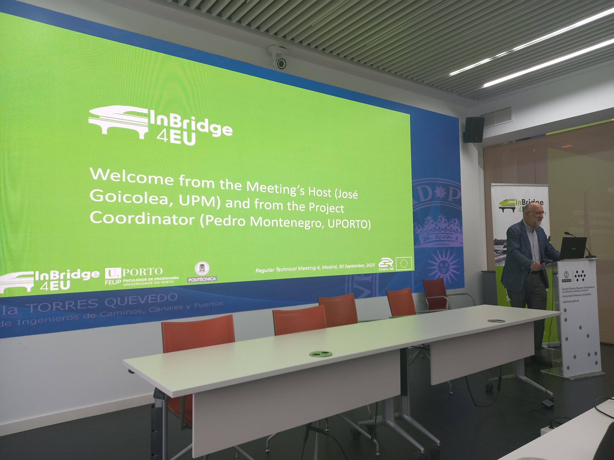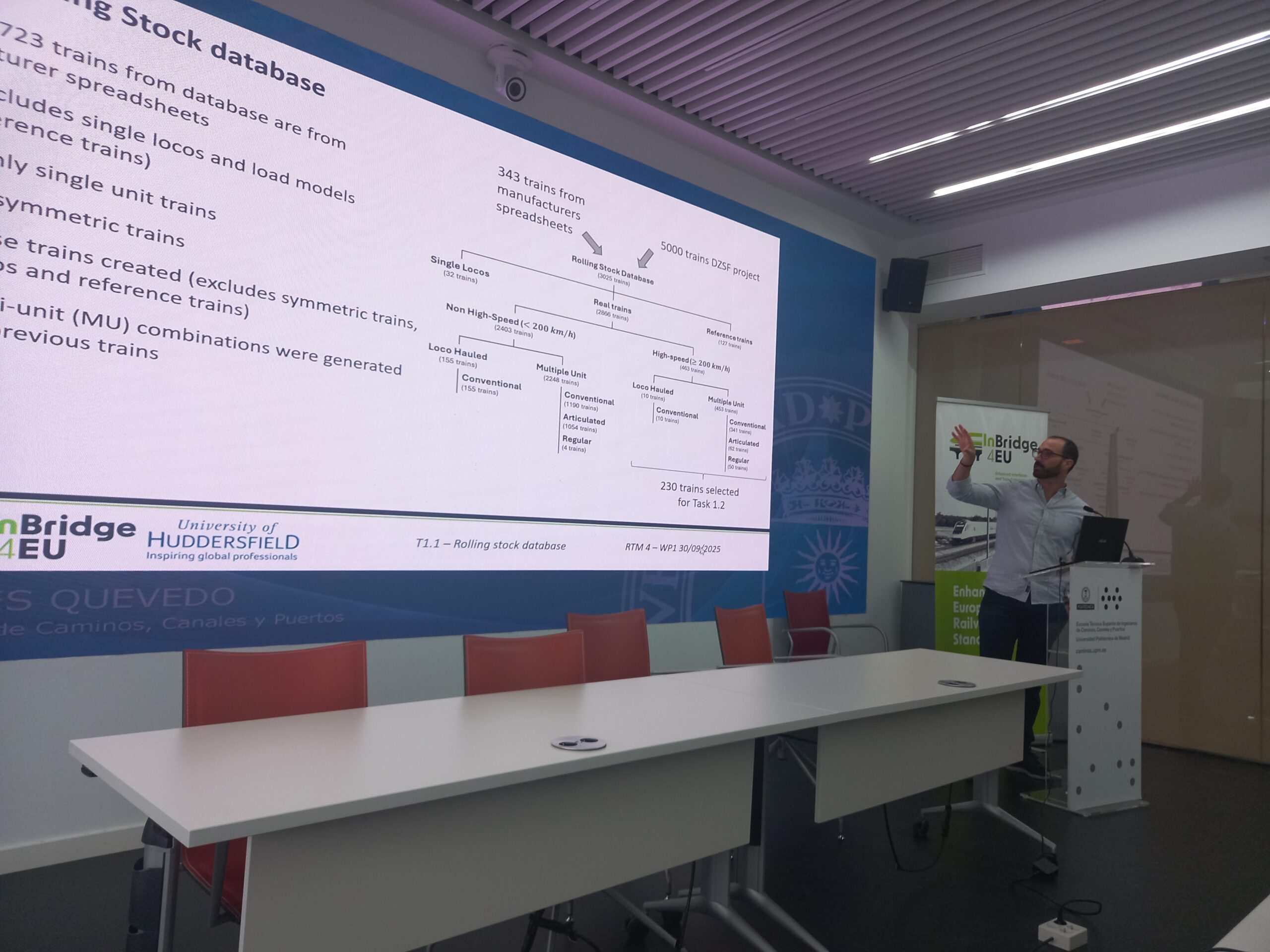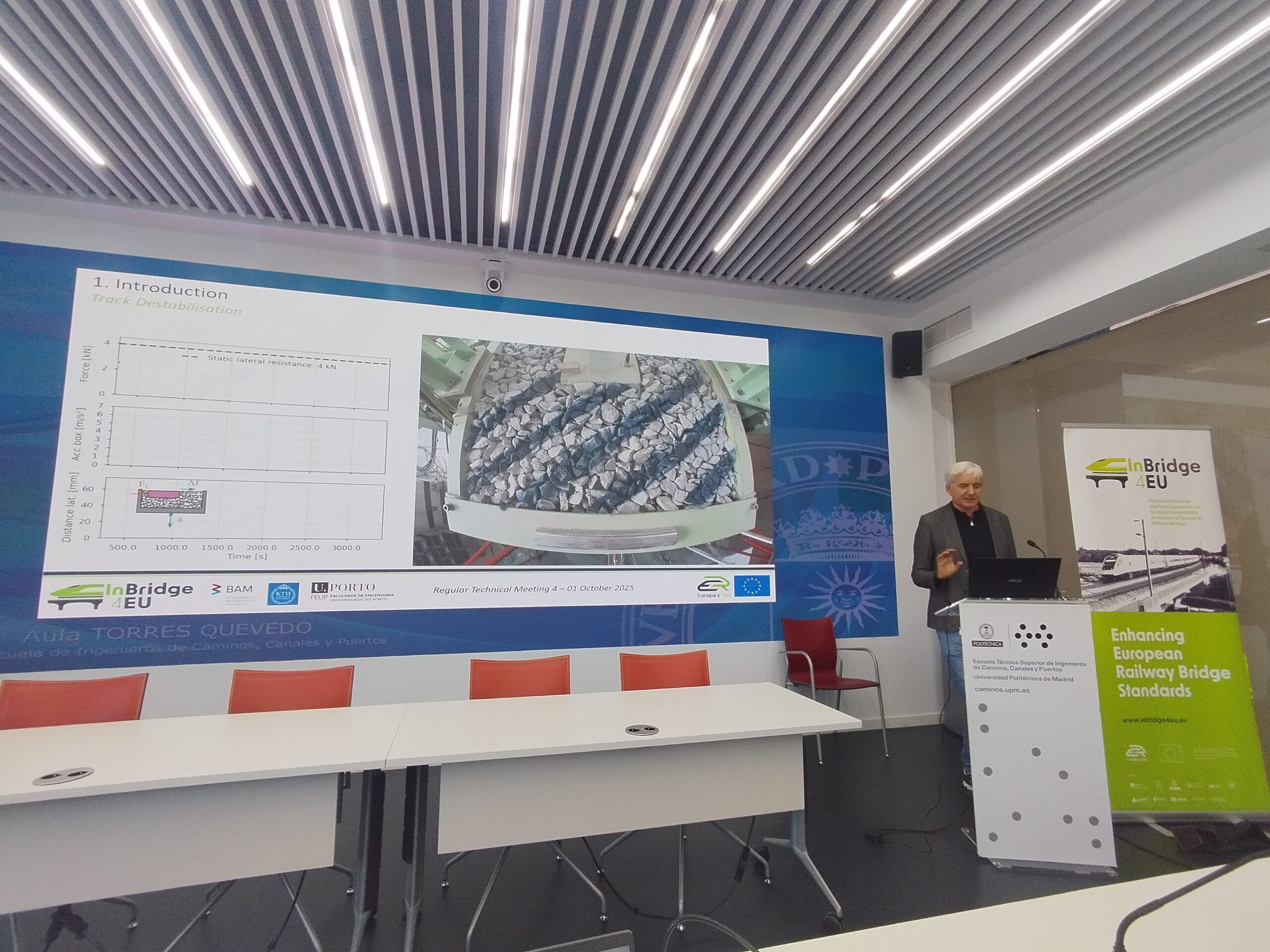 On September 30 and October 1, the InBridge4EU consortium convened at UPM (Madrid) for its fourth Regular Technical Meeting (RTM). At the “Escuela Técnica Superior de Ingenieros de Caminos, Canales y Puertos”, the event brought together project partners, members of the Advisory Board, and representatives from Europe’s Rail, fostering a dynamic exchange of ideas on the future of railway bridge dynamics in Europe.