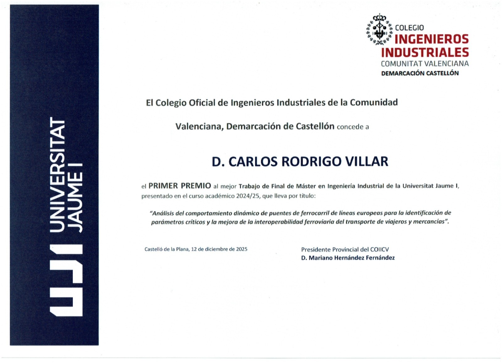 The thesis, titled “Análisis del comportamiento dinámico de puentes de ferrocarril de líneas europeas para la identificación de parámetros críticos y la mejora de la interoperabilidad ferroviaria del transporte de viajeros y mercancías”, examines how the dynamic behavior of railway bridges influences interoperability and safety. This work was developed in connection with the InBridge4EU project, closely aligned with its objectives, contributing to an improved understanding of critical parameters for high-speed and mixed-traffic lines.